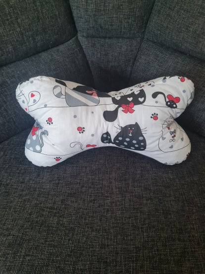 Zwei Seiten haben den gleichen, lustigen Stoff mit Katzen. Die dritte Seite ist uni hellgrau
